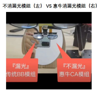此外,針對市面上同類BB方案普遍存在前方漏光問題(下圖左目),AR眼鏡的前方會泄露消費者觀看畫面,惠牛最新研發的BB模組解決了該問題(下圖右目),充分保護了眼鏡使用者的隱私。