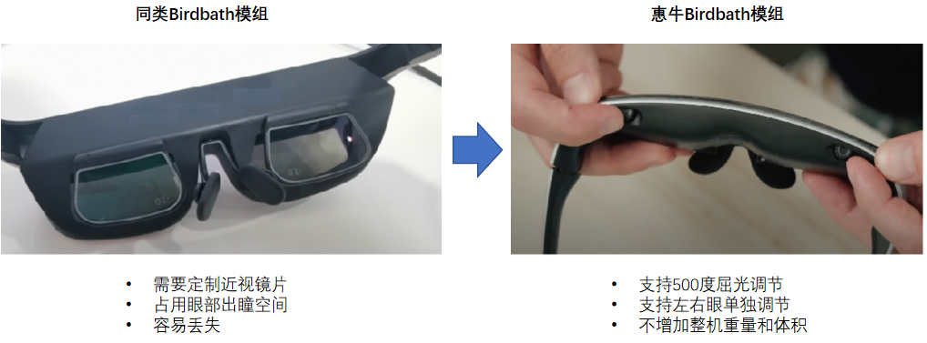 惠牛的BB模組還包含了:屈光調節、前方消漏光(保護隱私)、(光學樹脂)耐摔、防霧等特性,綜合性能優勢獲得了多家大品牌整機客戶的認可與批量采購。